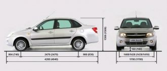 Compared to previous VAZ models, the Lada Kalina has increased in size, which has a positive effect on the space in the cabin and the amount of luggage space in the trunk; the dimensions are noticeably larger. Note that the height, as well as the width, of the car remained unchanged, but the length increased noticeably.