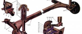 The beam structure includes a connector and two trailing arms; these elements are indicated in the diagram as numbers “12” and “13”. The parts are fastened together by welding. In the rear part, flanges (number “15”) and brackets for attaching struts (shock absorbers) are attached to the levers. The axles of the rear pair of wheels along with the brake elements are screwed to the flanges. Bushings (16) are installed on the rear suspension arms at the front. They are fastened using rubber-metal hinges - number “1”. One end of the spring rests on the support through a rubber gasket, and the other on the shock-absorbing cup.