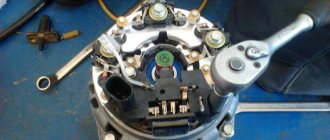 Typically, repairs involve a complete replacement, but the generator itself does not need to be completely removed from the car. However, first you need to remember to remove the terminals from the battery, 12 V is not much, but it will be unpleasant to get hit. After the car has been de-energized, you need to remove the caps from the generator terminals and unscrew them with a screwdriver. Now you need to carefully remove the protective casing from the generator; on the VAZ 2114 it is equipped with spring latches; it is important not to break them right away. Now the voltage regulator of the VAZ 2114 generator will be visible under the casing; you need to unscrew its fastenings and pull it out of the seats along with the brushes.