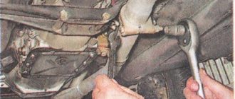 - Затем снизу, под автомобилем, выворачиваем кронштейн с помощью рожкового ключа на 13 и выворачиваем его, а затем снимаем его вместе с амортизатором: